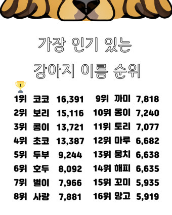 많은 사람들이 선택한 인기 있는 강아지 이름을 소개합니다. 이름을 통해 강아지의 성격이나 외모를 유추할 수 있어요.